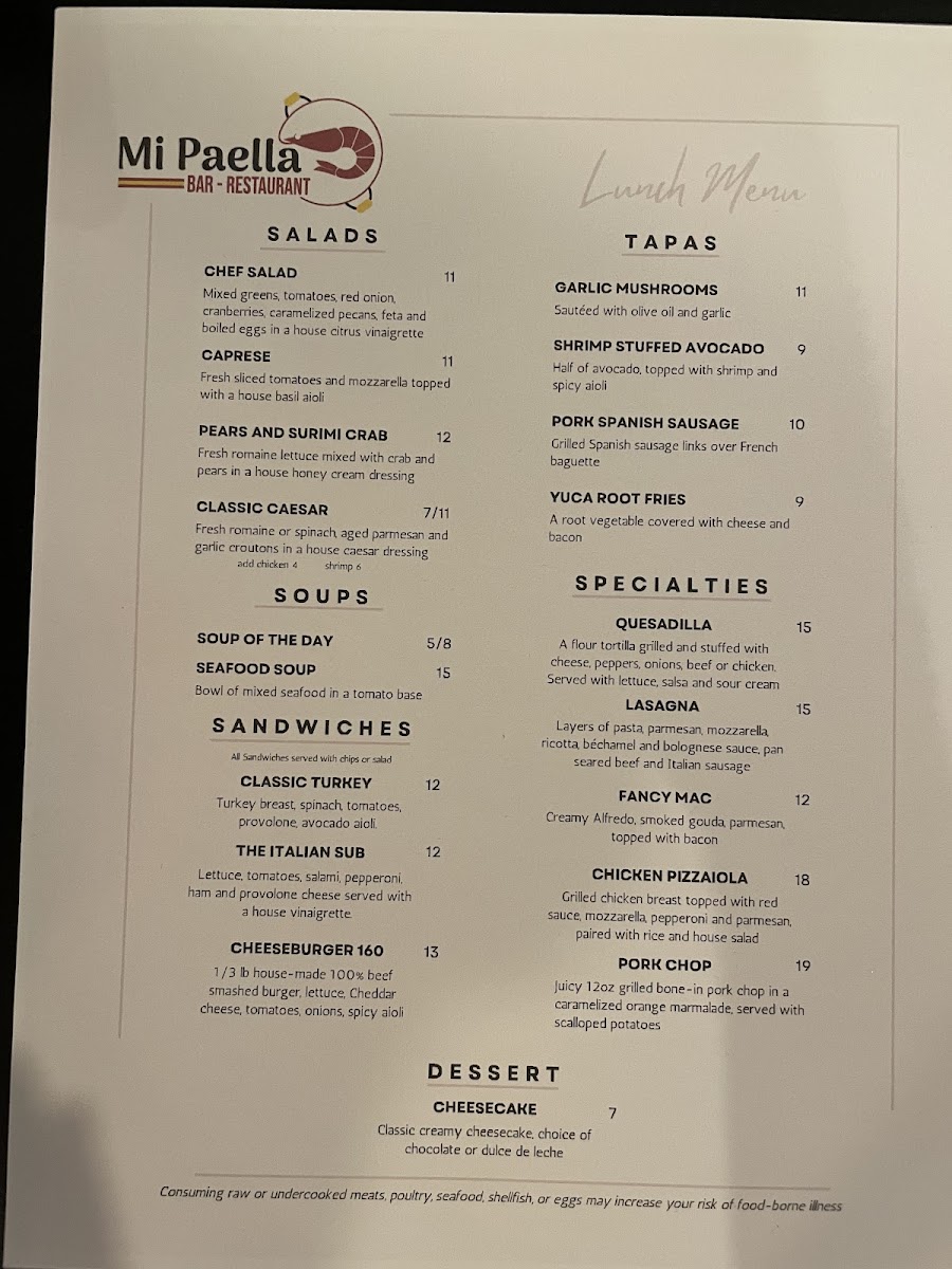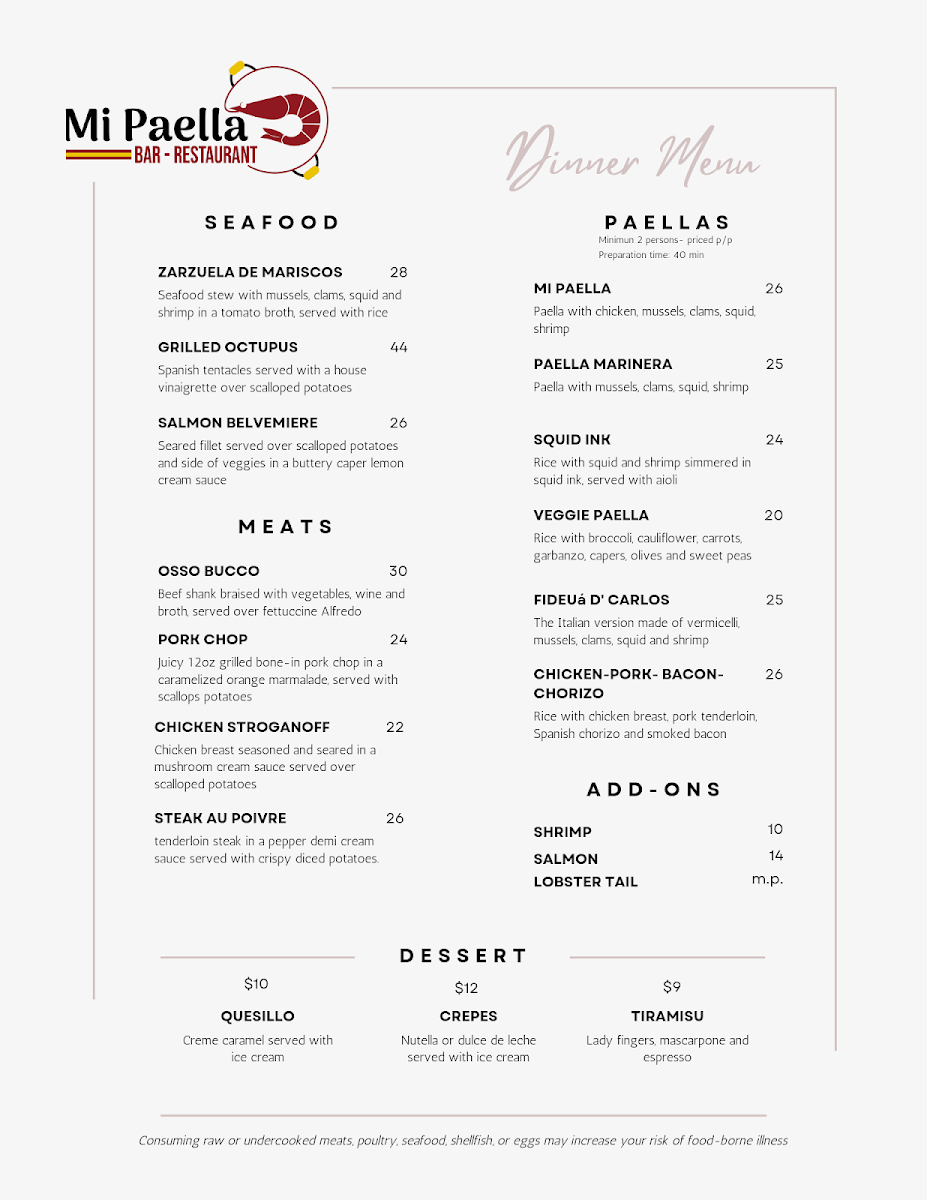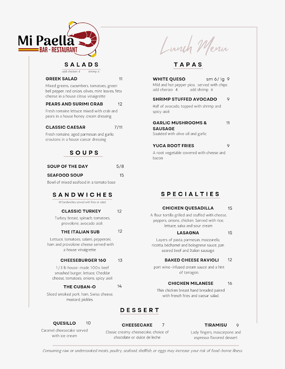 At Mi Paella Bar-Restaurant Menu, located at 1501 N University Ave in Little Rock, AR, you'll find a vibrant blend of flavors that bring the best of Spanish cuisine straight to your table. Whether you're craving a traditional, hearty paella or looking to explore smaller tapas, every dish is crafted with fresh ingredients and a lot of love. The menu offers a variety of options, from seafood and chicken to vegetarian choices, all served with bold, authentic seasonings.